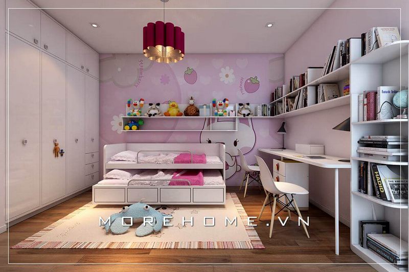 Nội thất phòng ngủ hiện đại được bố trí khoa học và ngăn nắp, tạo cho con có một không gian tràn đầy hứng khởi, kích thích sự sáng tạo của bé