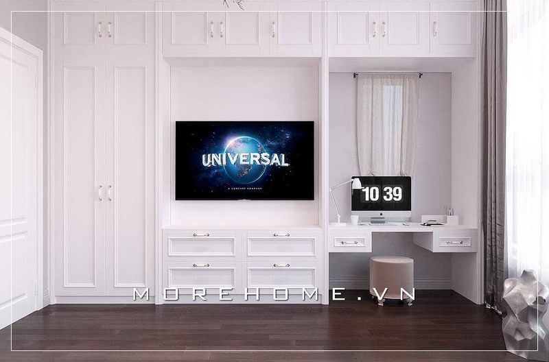 Tủ quần áo gỗ tân cổ điển màu trắng được thiết kế nhiều ngăn giúp cho gia chủ có thể dễ dàng lưu trữ quần áo của mình